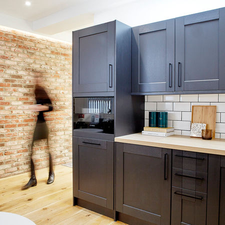 We collaborated with the client to create a modern design that respects the historic building's original features, including exposed brick walls and renovated hardwood floors. These elements add texture and contrast to contemporary additions like architectural glass partitions.