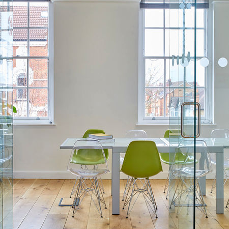 The Richmond Charities’ new office design, inspired by nearby Kew Gardens and Richmond Park, reflects their commitment to staff and community wellbeing. The space features biophilic elements like vibrant greens and soft textures, combined with sleek Crittall and reeded glass, creating an invigorating environment. The exterior’s standout green door embodies the charity’s brand and ensures visibility for elderly clients.